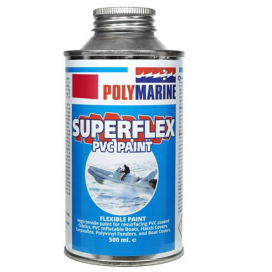 Polymarine have formulated a specialist PVC paint called Superflex for the renovation of inflatable boats made from PVC and any other PVC variant material. Superflex adheres in a super strong flexible bond, becoming part of the surface withstanding weathering, abrasions and retaining colours and bright whites for many years. It has a super high stretch ratio that will not crack or flake off. Superflex’s coating properties are highly opaque, easy to apply and quick drying. Application is one coat for good surface adhesion and a second coat for a smooth satin appearance and improved, lasting durability to UV and the elements. The Unique Properties of Superflex Paint *A fully flexible paint formulated for renovating PVC and any other PVC variant fabric. *Bonds into the PVC surface for a super tough and flexible finish. *Smooth satin finish, will not crack or flake off. *No mixing required, just a vigorous shake. *Seawater and UV sunlight resistant. *Many uses including hatch covers, PVC fenders, boat covers, spray dodgers etc. *Supplied in 500ml containers. *1 x 500ml Tin is enough to apply two coats of paint on 2 to 3 square metres. *‘Touch-Dry’ in 15 minutes at 20°C. *Second Coat can be applied when ‘Firm-Dry’ after a minimum 1 hour. *‘Hard-Dry’ is achieved after 24 hours or a minimum of 8 hours at 20°C. APPLICATIONShake the Paint Tin vigorously prior to application. Add the approximate amount of paint you intend to use in one session to a paint kettle or similar container. Stir the container of paint every few minutes. BY BRUSH (recommended) It is recommended that Superflex be applied using a good Brush with Natural Bristles. Synthetic Bristles may dissolve due to the solvents present within Superflex. ROLLERS (not recommended)Use of Gloss Paint Rollers is not recommended as they’re usually synthetic and prone to breaking down due to solvents, thus spoiling your final finish. SPRAY PAINTING – Professional use only with appropriate breathing apparatusSpraying can be done using the Polymarine Superflex 2661 Thinners, at a mix ratio of 1 Base to a maximum of 30% Thinners. Two spray coats should be applied as a minimum. Refer to SDS for cautionary and safety procedures.