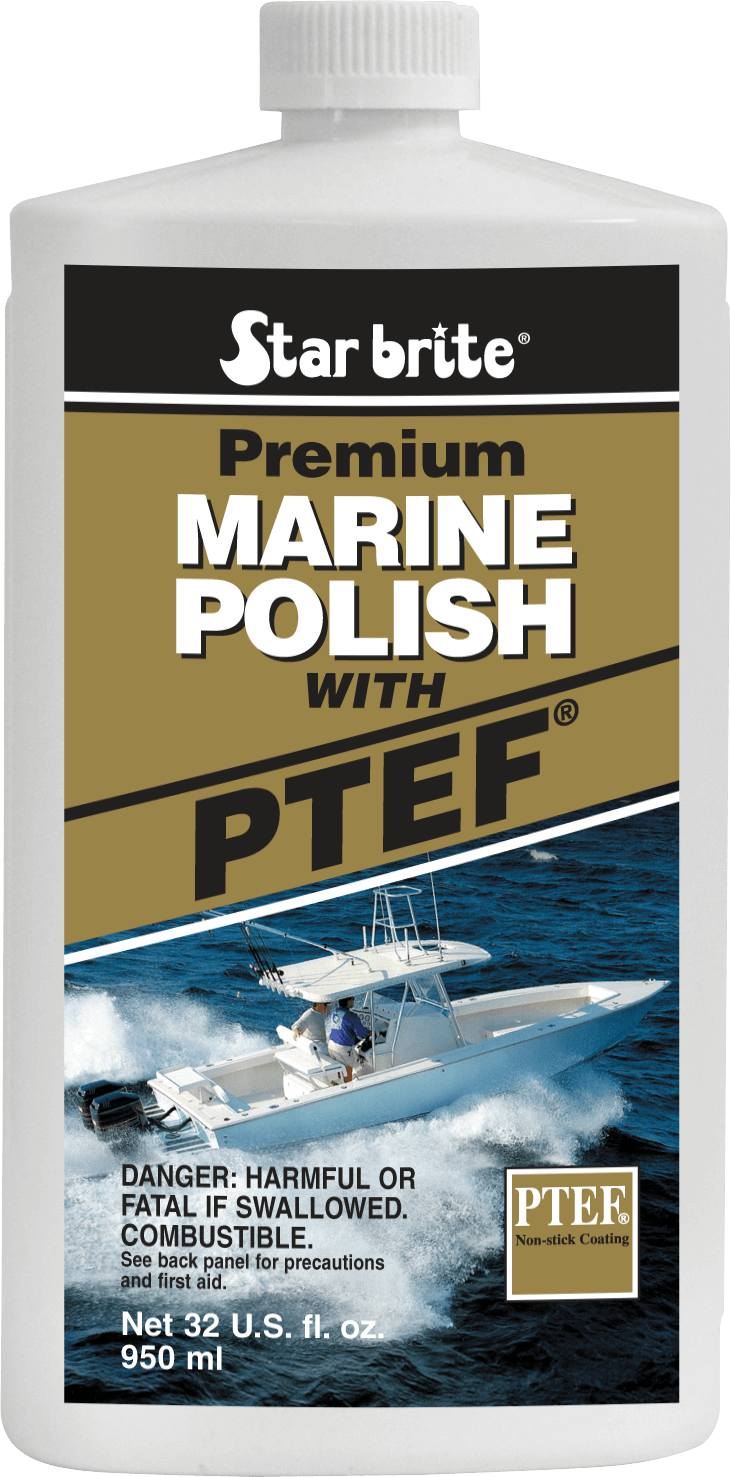 Description Premium Marine Polish with PTEF is simply the best polish you can buy. The PTEF polymers provide unmatched protection against UV rays, seal the surface to repel stains and deliver a deep, long-lasting gloss. Application is simple, whether by hand or with a buffer; apply, let dry to a haze and wipe off. Use once per year to keep new and restored boats looking their best. Ideal for all fiberglass, metal, glass or painted surfaces. Note: if surface is oxidized or hazy, use One Step Heavy Duty Cleaner Wax with PTEF. Features