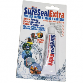 Now better that ever Sure Seal Extra, the flexible repair sealant and adhesive for a waterproof permanent repair to coated fabrics, PVC, PU, neoprene, rubber, leather, most plastics and fabrics This multi-use sealant adhesive can be used to repair a whole range of marine, leisure and household items. SureSealExtra will adhere to most surfaces including: Hypalon, Rubber, PVC, Nylon, Neoprene, Polyurethane, Leather, Vyanide, Vinyl, Fibreglass, Glass, Wood, Metal, etc SureSealExtra can be used on: Inflatable Boats and Rib Tubes, Wet Suits, Dry Suits, Waders, Boat Fenders, Tents and Awnings, Sails, Diving and Skiing Equipment, Foul Weather Gear, Flotation Vests, Footwear, Inflatable Toys, Vinyl Upholstery and thousands more items. Creates a tough resiliant skin to repair actual holes without the need for a fabric patch. Application: APPLY DIRECTLY TO AREA. KEEP FLAT. Touch dry in 2 – 4 hours, but allow 10 – 12 hours for a full cure. Holes: Cover back of hole with clear tape. Apply SureSealExtra to cover the tape and overlap edge of hole by 10mm. Remove clear tape after 10 hours.